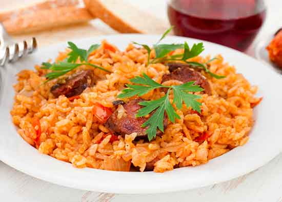 Chorizo, bacon, solomillo, cebolla, ajo, nata y vino tinto.