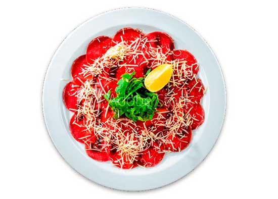 Finas láminas de solomillo, limón, apio, rucula y queso parmesano.