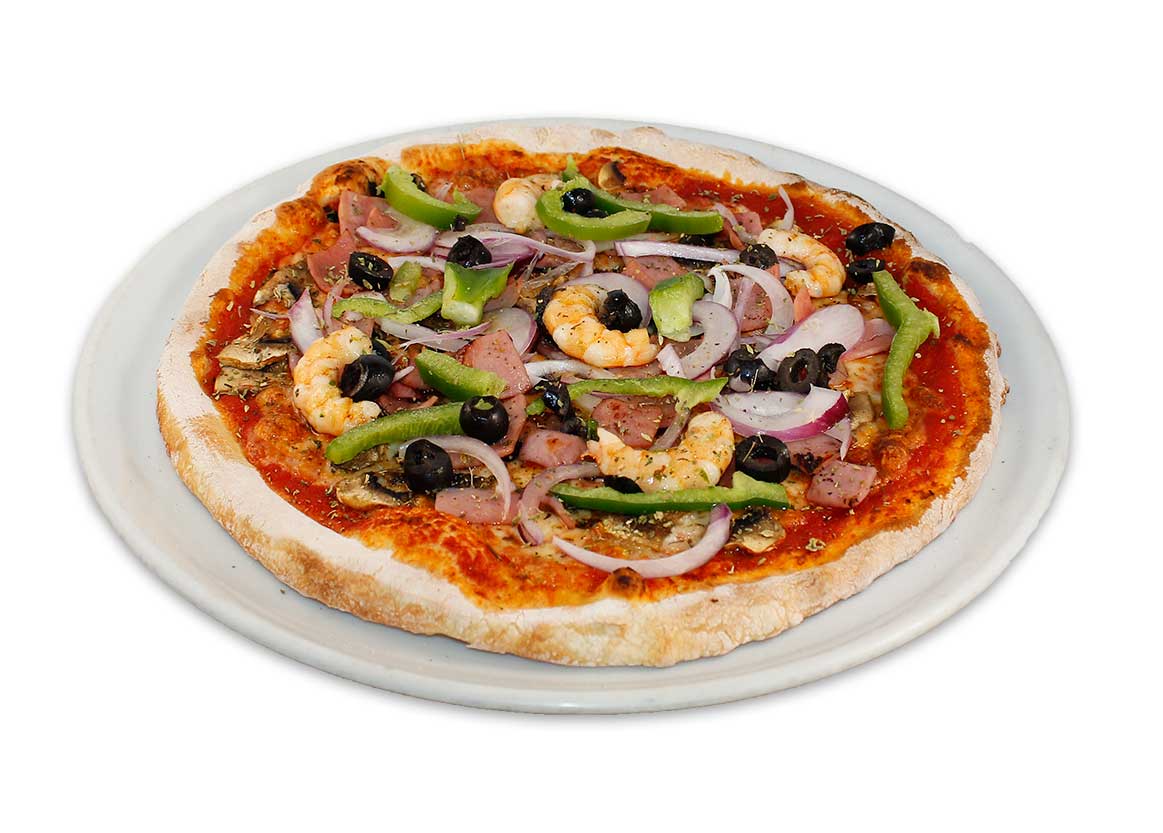 Jamón, pimiento, cebolla, champiñones, gambas, aceitunas negras y orégano.