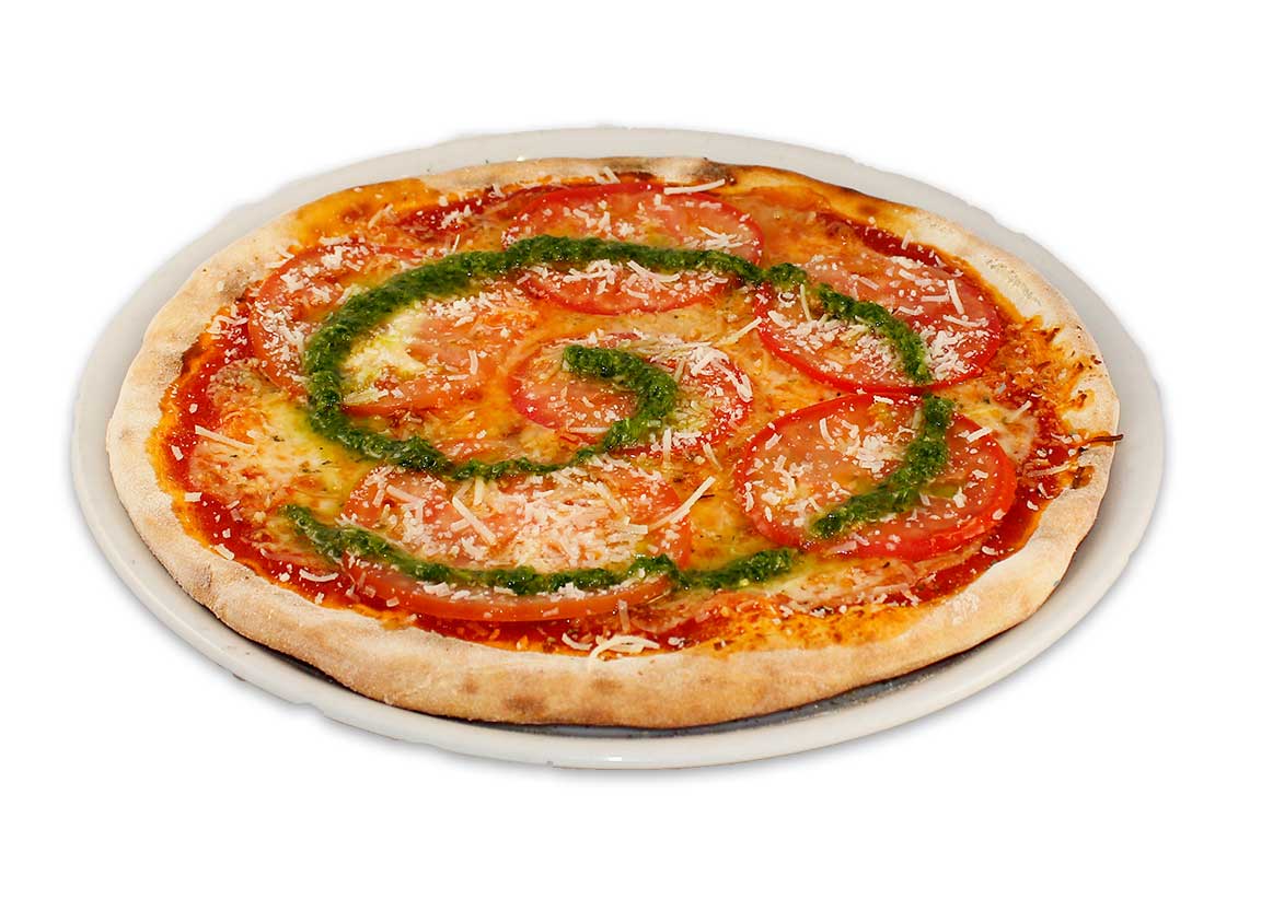 Rodajas de tomate, queso rallado, salsa verde* y orégano.