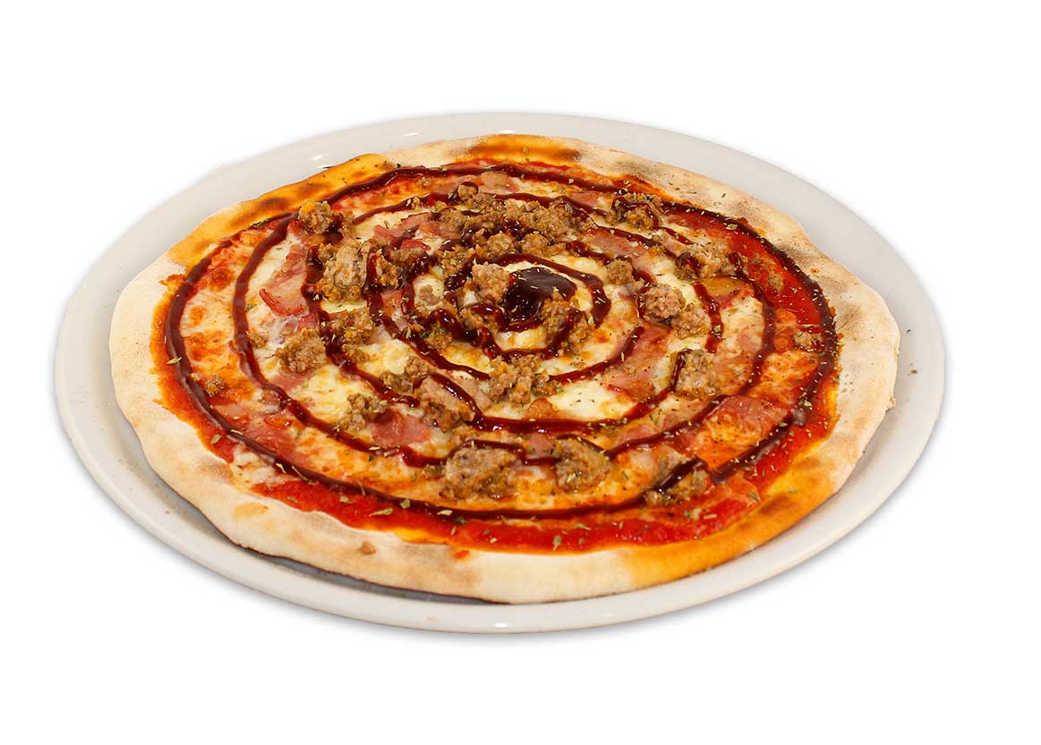 Carne, bacon, salsa barbacoa por encima y orégano.
