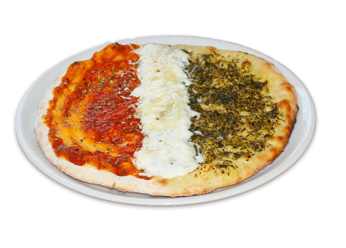 Masa de pizza con una parte Roja, una parte con Mozzarella y la última parte Verde con orégano.