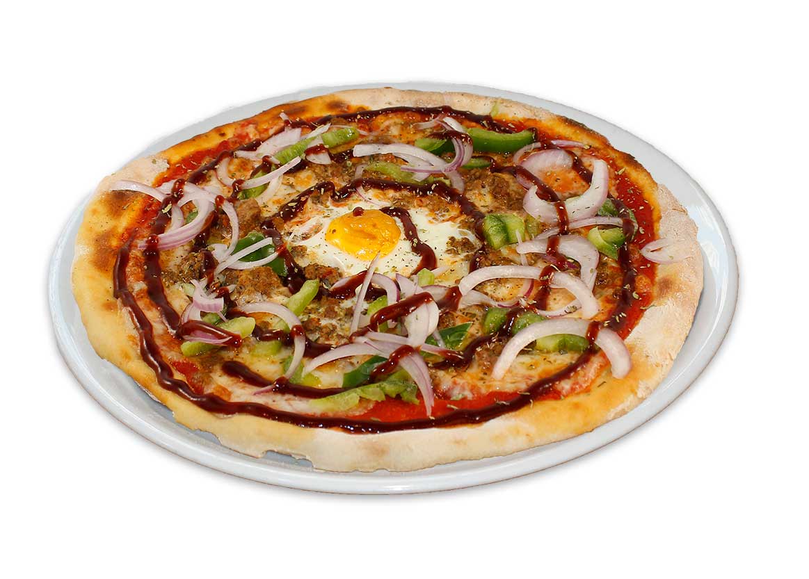 Carne, pimiento, cebolla, huevo, salsa barbacoa por encima y orégano.