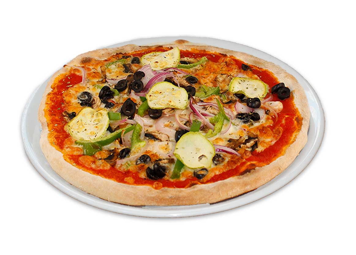 Champiñones, cebolla, calabacín, pimiento, aceitunas negras y orégano.